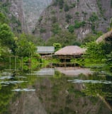 Ẩn mình trong thung lũng Chẽ Bèo – nơi được bao quanh bởi núi đá vôi và hồ sen tự nhiên, Halise Home hiện lên như một bức tranh thủy mặc với những mái nhà lá đậm chất Bắc Bộ xưa. Không gian nơi đây hòa quyện giữa kiến trúc truyền thống và vẻ đẹp nguyên sơ của thiên nhiên.